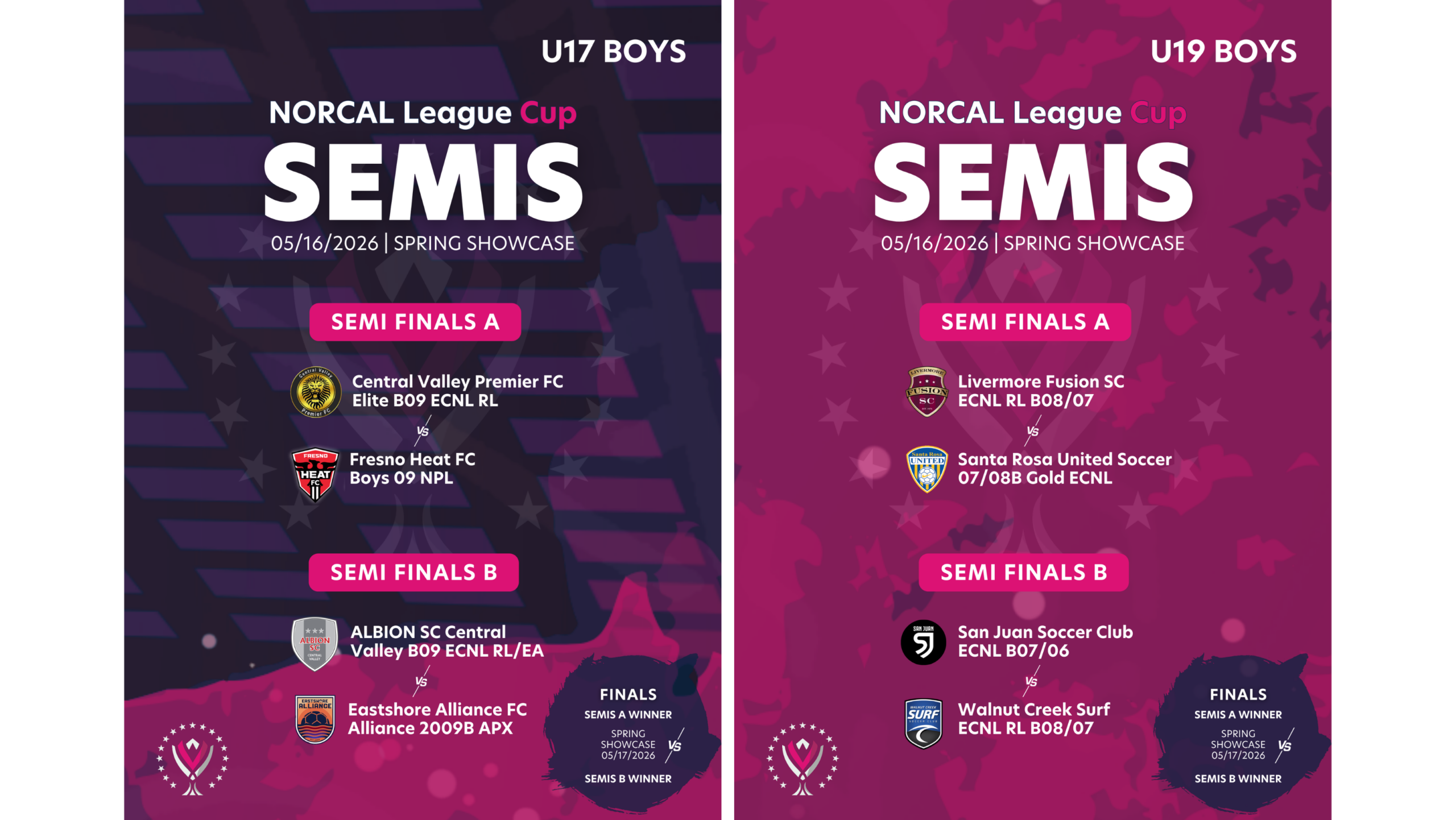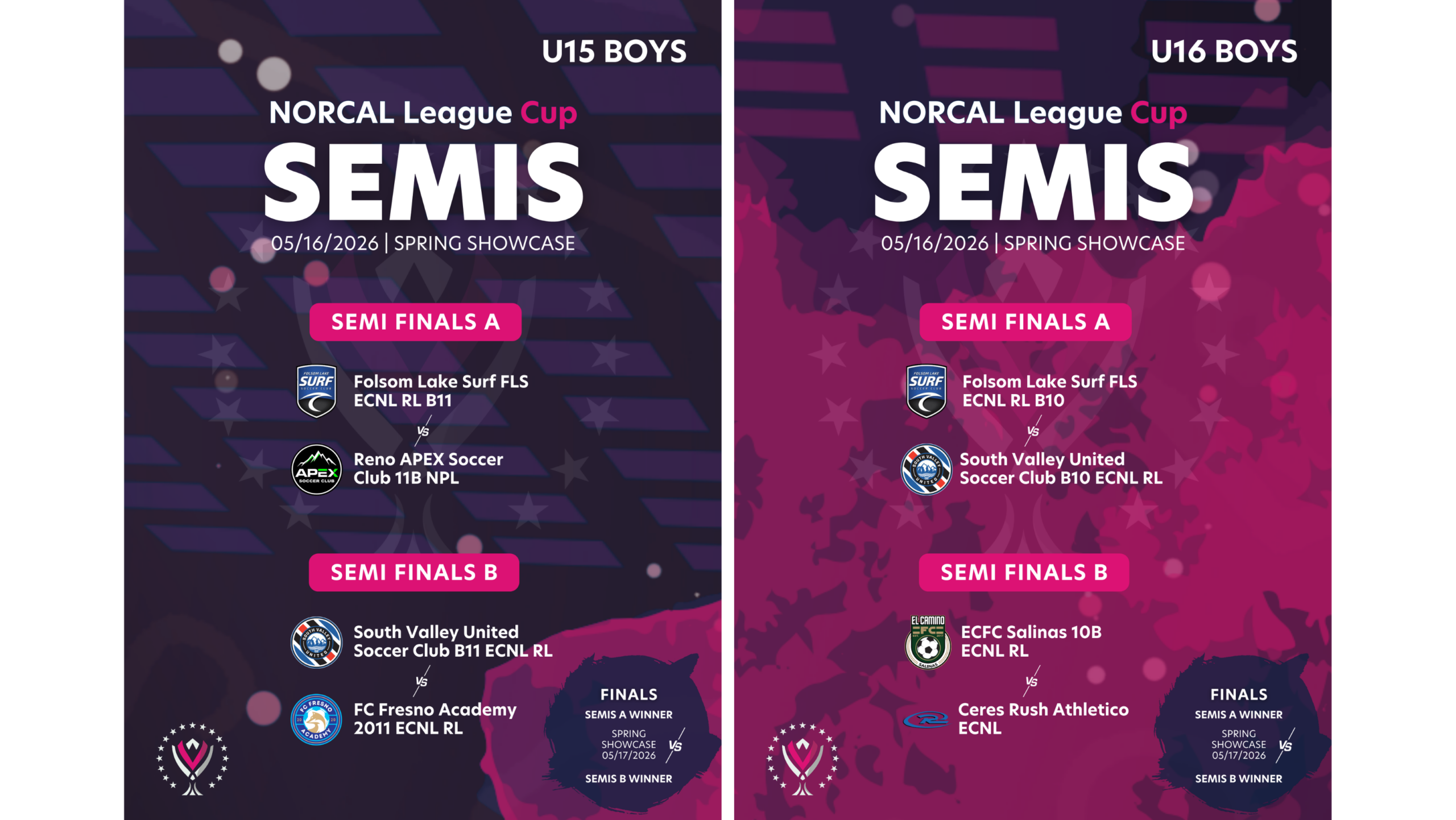 While the League Cup included dozens of clubs from all across the state, on the boys side, only Folsom Lake Surf, San Juan SC, Santa Rosa United, Silicon Valley Eagles, and Union Sacramento saw two of their sides qualify for the knockout stages.