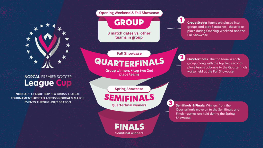 All NorCal League Cup matches will take place across three hosted weekends: the Opening Weekend, NorCal Fall College Showcase, and the NorCal Spring College Showcase.